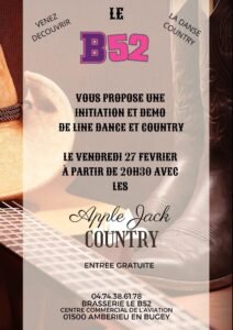 Initiation et Démon de Line Dance et Country, chez *Apple Jack Country*, à partir de 20h30, Le B52, Centre Commercial de L’aviation, à Amberieu Bugey, (01500).Ain.