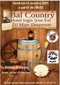 Le Vendredi 24 Octobre 2025, Bal Country animé par *DJ Marc Duquesne* à 19h30, chez *Copains D’Abord Beynost*, Hotel Logis Lyon Est , Sortie 5, Beynost (01), Ain.