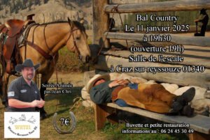 Le Samedi 11 Janvier 2025, Bal Country animé par *Jean Chri*, à 19h30, chez *Western Horseman Team 01*, Salle de L’escale, à Craz sur Reyssouze (01340), Ain.