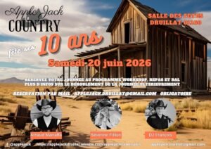 Le Samedi 20 Juin 2026, Journée Country animée par *DJ Francois*, chez *Apple Jack Country* qui Fetera ses 10 ans avec *Arnaud Marraffa*et *Séverine Fillion* , à la Salle des Fete