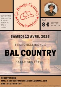 Le Samedi 12 Avril 2025, Bal Country animé par *Francois*, chez *Ca Bouge Country*, à 19h00, Salle des Fetes de Francheleins (01) Ain.