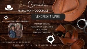 Le Vendredi 07 Mars 2025, Soirée Country animée par vos animateurs préférés, au Restaurant Cocktails *La Comédie*, 03, Impasse de la Leppe, à Meximieux (01800), Ain.