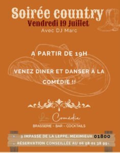 Le Vendredi 19 Juillet 2024, Soirée Country avec *DJ Marc*, à 19h00, à *La Comédie*, 03, Impasse de la Leppe, à Meximieux (01800), Ain.