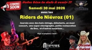 Le Samedi 30 Mai 2026, Journée Country des *Riders de Niévroz*, animée par *DJ Jean Chri* et *Chrytel Durand*, avec Bals Vintage, Concert des *Crazy Pug*, à Niévroz (01), Ain.