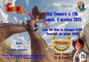 Le Samedi 04 Octobre 2025, Bal Country animé par *DJ Francois*,chez Blue Patt Country*, à 19h00, Salle des Fetes de Peronnas (01960), Ain.