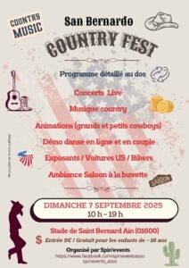 Le Dimanche 07 Septembre 2025, Journée Country Fest , avec Concerts Live, Musique Country, Animations, Démos Danse en Ligne et Couple, Exposants, Ambiance Saloon, de 10h00 à 19h00, au Stade de St Bernard, (01