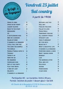 Le Vendredi 25 Juillet 2025, Bal Country à 19h30, Le Café *Le Voyageur*, 45 Chemin de la Bergaderie, à St Etienne du Bois (01370), Ain.