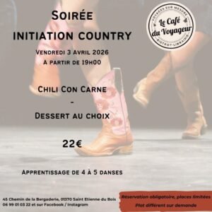 Le Vendredi 03 Avril 2026, Soirée Initiation Country à partir de 19h00, au *Café du Voyageur*, 45 Chemin de la Bergaderie, à t Etienne du B