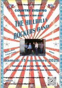 Le Samedi 15 Novembre 2025, Soirée Country des *Swan Rangers*, avec Concert de *The Hillbilly Rockers Band*, à 20h00, Salle Polyvalente de St Jean de Gonville (01