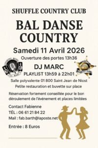 Le Samedi 11 Avril 2026, Bal Country animé par *DJ Marc*, chez *Shuffle Country Club*, de 13h59 à 22h01, Salle Polyvalente de St Jean de Niost (01800), Ain.