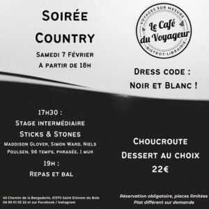 Le Samedi 07 Février 2026, Soirée Country à partir de 17h30, avec Stage, Repas et Bal, au Café du Voyageur, 45 Chemin de la Bergaderie, à