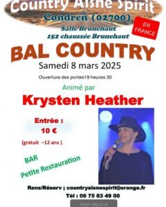 Le Samedi 08 Mars 2025, Bal country Concert animé par *Krysten Heather*, à partir de 19h30, Salle Brunehaut, 152 Chaussée Brunehaut, à Condren (02700), Aisne.