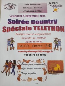 Le Vendredi 05 Décembre 2025, Soirée Country chez *Country Aisne Spirit*, à 19h00, pour le Téléthon, Salle Brunehaut, 152 Chaussée Brunehaut, à Condren (02700), Aisne.