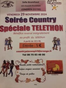 Le Vendredi 29 Novembre 2024, Soirée Country au profit du Téléthon, chez *Countryainespirit*, à 19h00, Salle Brunehaut, 152, Chaussée Brunehaut, à Condren (02700), Aisne.