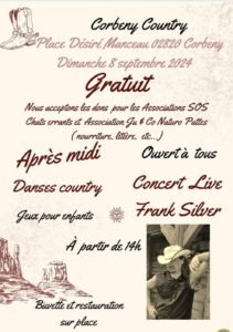 Le Dimanche 08 Septembre 2024, Après Midi Country Music et Dance avec un Concert de *Frank Silver *, à 14h00, Place Désiré Manceau, à Corbeny (02820), Aisn