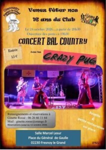 Le Samedi 24 Octobre 2026, Bal Country avec Concert des *Crazy Pug*, à 20h30, Salle Marcel Lesur, Place du Général de Gaulle, à Fresnoy le Grand (02230), Ais