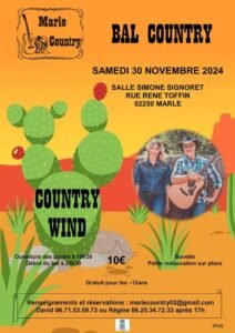 Le Samedi 30 Novembre 2024, Bal Country à 20h30, Salle Simone Signoret, rue René Toffin, à Marle (02250), Aisne.
