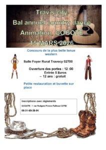 Le Dimanche 15 Mars 2026, Après Midi Bal Country annuel chez *Trav’s City*, animé par *Gogotte*, à partir de 12h00, Salle Foyer Rural, à Travecy (02700), Aisne.