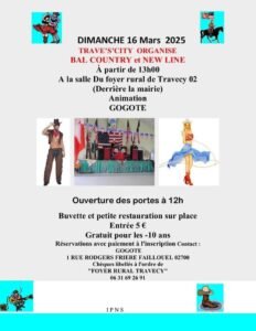 Le Dimanche 16 Mars 2025, Après Midi Bal Country et New Line, animée par *Gogote*, à partir de 13h00, Salle du Foyer Rural, Derrière la Mairie, à Travecy (02) Aisne.