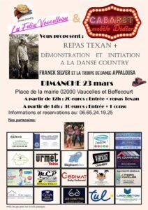 Le Dimanche 23 Mars 2025, Après Midi Repas Texan et Démonstration + Initiation de Danse Country, avec *Frank Silver* et *Appalousa*, à partir de 12h00, Place de la Mairie, à Vaucelles et Beffecourt (02000), Aisne.