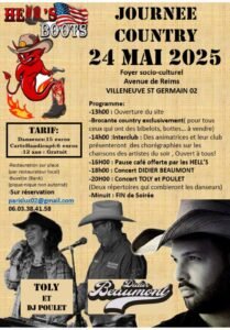 Le Samedi 24 Mai 2025, Journée Country à partir de 13h00, avec Concerts de *Didier Beaumont* et *Toly et DJ Poulet*, au Foyer Socio Culturel, Avenue de Re