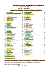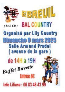 Le Dimanche 09 Mars 2025, Après Midi Bal Country cd de *Lily Country*, de 14h00 à 19h00, Salle Armand Pradel, Avenue de la Gare, à Ebreuil (03450), Allier.