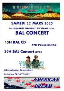 Le Samedi 22 Mars 2025, Journée Country Dance et Music , à partir de 15h00, avec Bal Country cd et Bal Country Concert de *Turquoise*, à 20h00, Salle Gabriel Peronnet, au Vernet (03200),