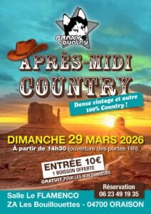 Le Dimanche 29 Mars 2026, Après Midi Bal Country chez *Frany Country*, (Danses Vintage et Autre 100% Country) , à 14h30, Salle Le Flamenco, ZA Les Bouillouettes, à Oraison (04700), Alpes de Haute Provence.