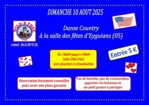 Le Dimanche 10 Aout 2025, Après Midi Bal Country de 14h00 à 19h00, chez *Wild & Free *, Salle Gillio Vital, Salle des Fetes de Eyguians (05), Hautes Alpes.