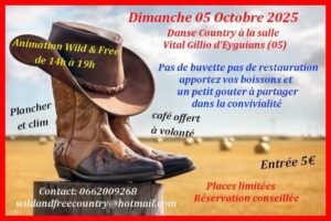 Le Dimanche 05 Octobre 2025, Après Midi Country Dance animée par *Wild & Free*, de 14h00 à 19h00, sur Plancher et avec Clim, Salle Vital Gillio, à Eyguians (05) Hautes Al