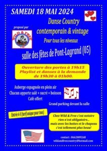 Le Samedi 18 Mai 2024, Soirée Country Dance (Contemporain et Vintage), de 19h30 à 01h00, Salle des Fetes de Pont Lagrand (05), Hautes Alpes.