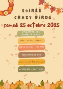 Le Samedi 25 Octobre 2025, Soirée Crazy Birds à 18h30, Salle du Val Fleuri, à Cagnes sur Mer (06800), Alpes Maritimes.
