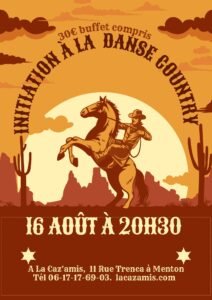 Le Samedi 16 Aout 2025, Soirée Initiation Country à 20h30, à la Caz’amis, 11 rue Trenca, à Menton (06), Alpes Maritimes.