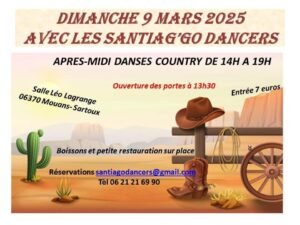 Le Dimanche 09 Mars 2025, Après Midi Bal Country des *Santiag’Go Dancers*, de 14h00 à 19h00, Salle Léo Lagrange, à Mouans Sartoux (06370) Alpes Maritimes.
