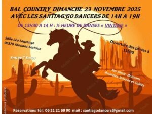 Le Dimanche 23 Novembre 2025, Après Midi Bal Country de 14h00 à 19h00, chez *Les Santiag’Go Dancers*, Salle Léo Lagrange, à Mouans Sartoux (06370), Al