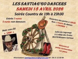 Le Samedi 18 Avril 2026, Soirée Country des *Santiag’Go Dancers*, animée par *DJ Sam*, de 19h00 à 23h30, Salle Léo Lagrange, Allée des Ecoles, à Mouans Sartoux (063