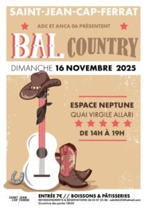 Le Dimanche 16 Novembre 2025, Après Midi Bal Country de *ADC et Anca*, de 14h00 à 19h00, Espace Neptune, Quai Virgile Allari, à St Jean Cap Ferrat (06230), Alpes Maritimes.