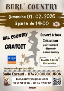 Le Dimanche 1er Février 2026, Après Midi Bal Country avec Initiations, chez *Burl’Country*, à 14h00, Salle Eyraud, à Coucouron (07470), Ardèche.