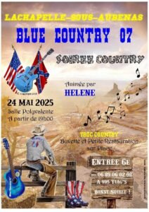 Le Samedi 24 Mai 2025, Soirée Country animée chez *Blue Country 07*, par *Helene* à partir de 19h00, Salle Polyvalente de La Chapelle sous Aubenas (07), A