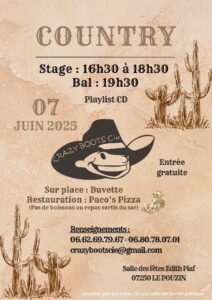 Le Samedi 07 Juin 2025, Journée Country chez *Crazy Boots Cie*, à partir de 16h30 à avec Stage et Bal cd , Salle des Fetes Edith Piaf, à Le Pouzin (07250), Ardèche.