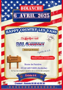 Le Dimanche 06 Avril 2025, Après Midi Bal Country animée par *Evelyne*, chez *Happy Country*, à 14h00, Route de Paiolive, Les Vans (07140), Ardèche.