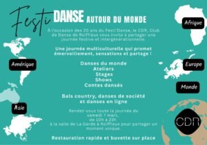 Le Samedi 07 Mars 2026, Journée Festi Danse pour les 20 ans du Club, de 10h00 à 23h00, avec Bals, Stages, Spectacles, Ateliers, Danse, Contes …, au Complexe Sportif de la Garde, à Roiffieux (07), Ardèche