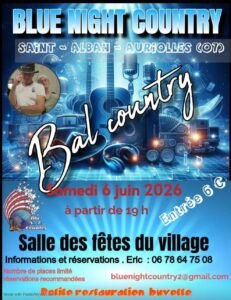 Le Samedi 06 Juin 2026, Soirée Country avec *Blue Night Country*, à 19h00, Salle des Fêtes du Village de St Alban Auriolles (07) Ardèche.