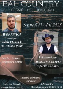 Le Samedi 10 Mai 2025, Soirée Country à partir de 17h00, chez *ASN Country*, avec Workshop de *Rémi Tardieu* et Bal Country animé par *Arnaud Marraffa*, à 19h00, Salle des Fetes de St Félicien (07410), Ardèche.