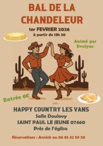 Le 1er Février 2026, Bal Country de la Chandeleur, animé par *Evelyne*, à 13h30, chez *Happy Country les Vans*, Salle Doulovy, à St Paul le Jeune (07), Ardèche.