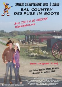 Le Samedi 28 Septembre 2024, Bal Country chez les *Puss In Boots*, avec *Toly et DJ Chicken*, à 20h00, Salle Arthur Rimbaud, à Amagne (08300), Ardennes.