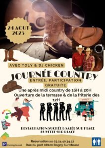 Le Dimanche 24 Aout 2025, Journée Country avec *Toly et DJ Chicken*, de 16h00 à 20h00, rue du port, à Bogny sur Meuse (08120), Ardennes.