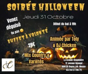 Le Jeudi 31 Octobre 2024, Soirée Halloween Country et Variétés, animée par *Toly et DJ Chicken* à 19h00, à La Grande Chaumière, 12, Avenue Blanqui, à Bogny sur Meu