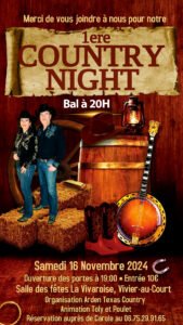 Le Samedi 16 Novembre 2024, 1ère Country Night des *Arden Texas Country, , à 20h00, avec *Toly et Poulet Animation*, Salle des Fetes *La Vivaroise*, à Vivier au Court (084