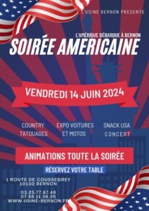 Le Vendredi 14 Juin 2024, Soirée Americaine présentée par *L’usine Bernon *, avec Country Tatouages, Expo Voitures et Motos, Concert, Snack USA, Animations toute la Soirée, au 01, Rout